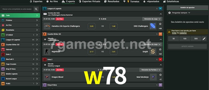 O w78 oferece uma grande seleção de opções de apostas em e-sports com probabilidades competitivas